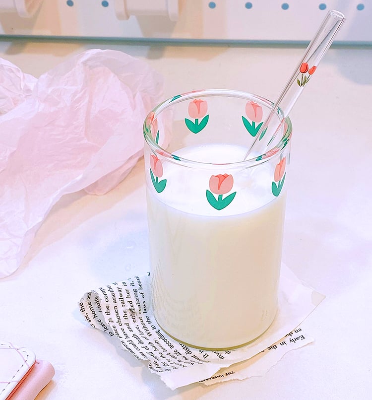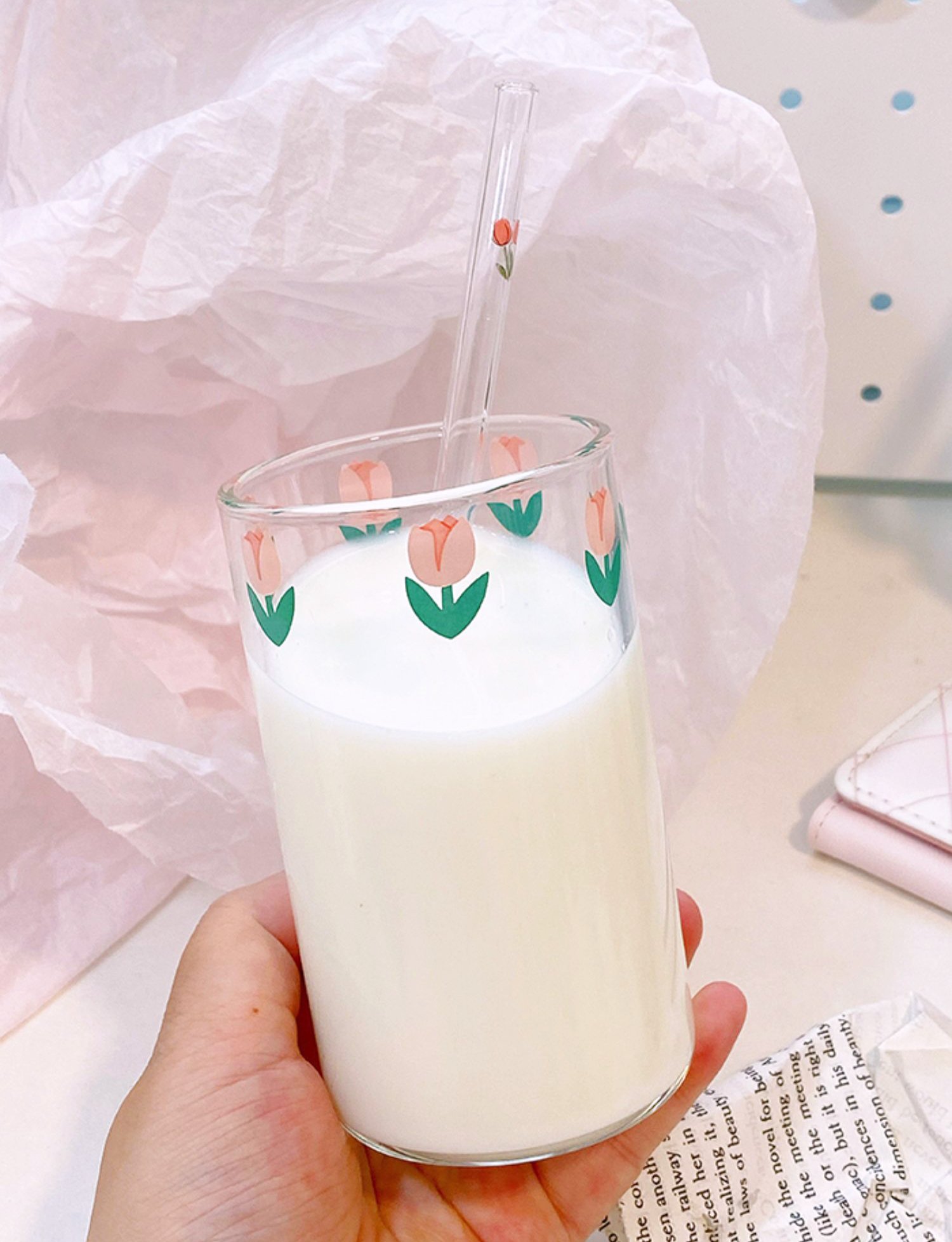 *Free Shipping*CUTE TULIPS GLASS CUP WITH STRAW