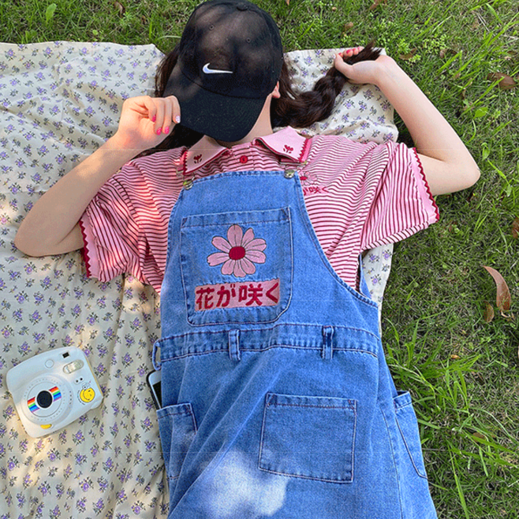 *Free Shipping*BLOOMING FLOWER DENIM DUNGAREE DRESS