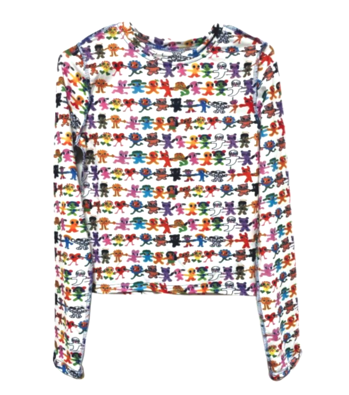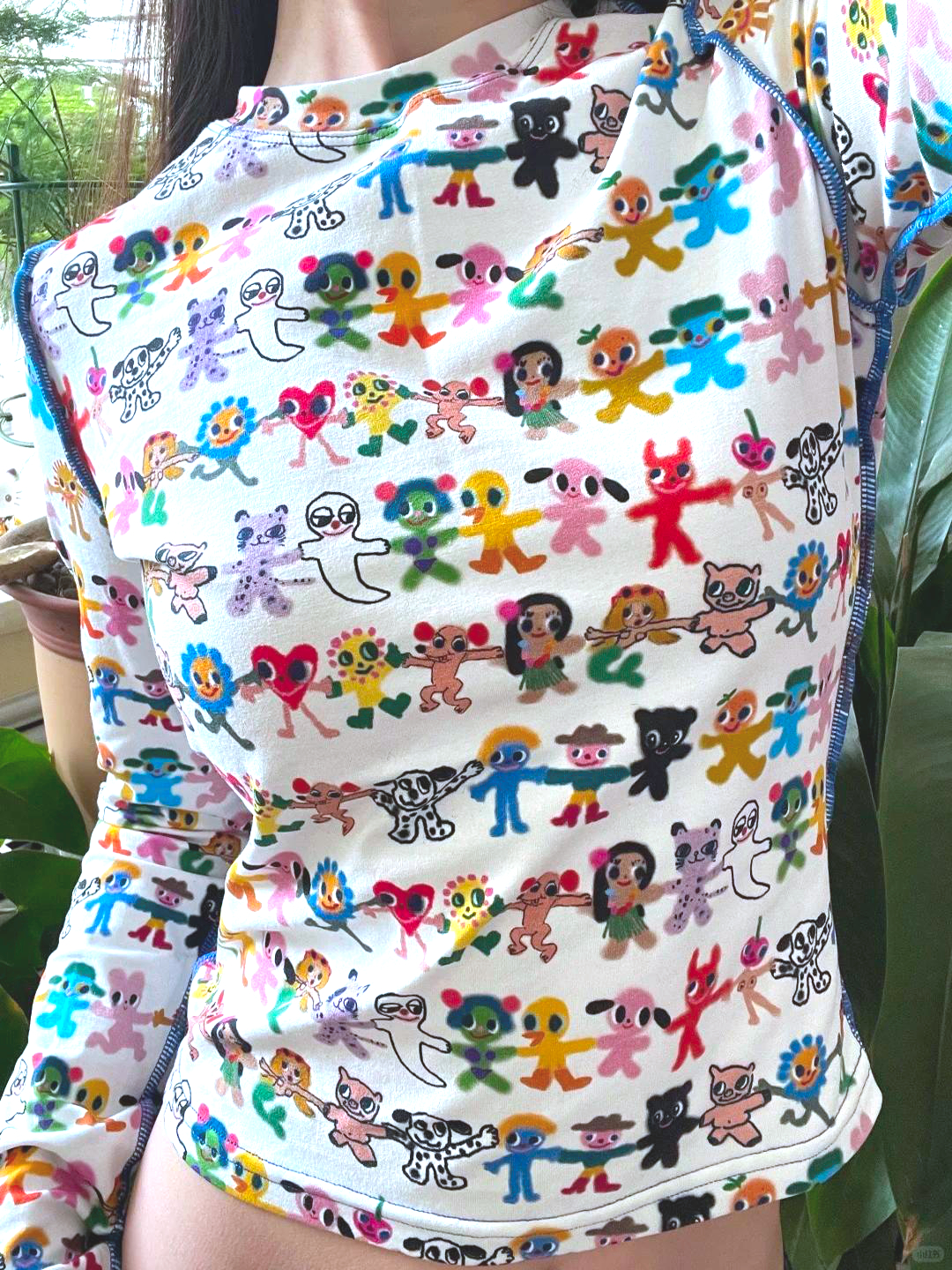 Spread the joy in our super cute Hand-in-Hand Crop Top! 🌈✨ Adorable colorful doodle friends dancing all over a soft, fitted long-sleeve – perfect for adding a playful pop of happiness to any outfit! 💕 Who’s ready to join the fun?"